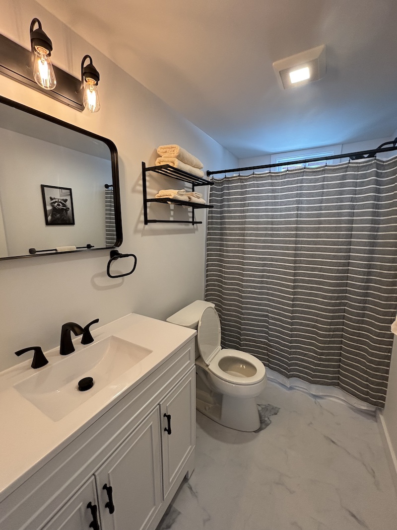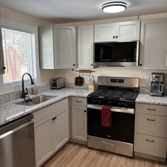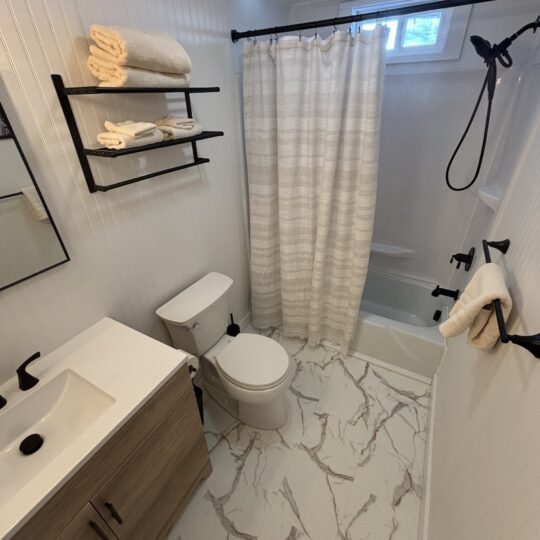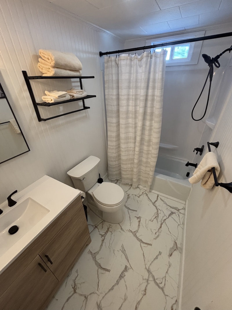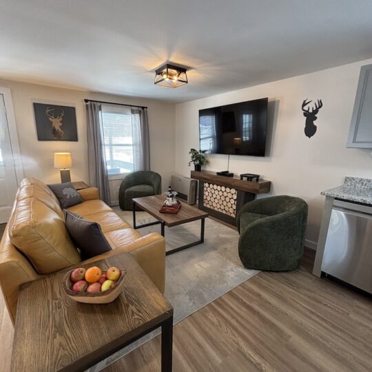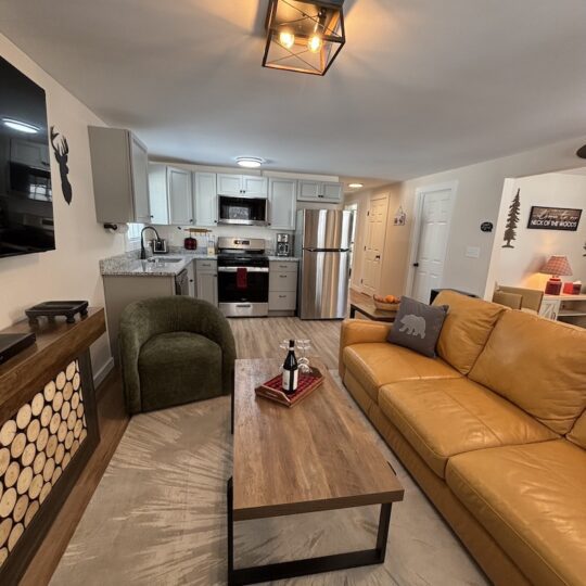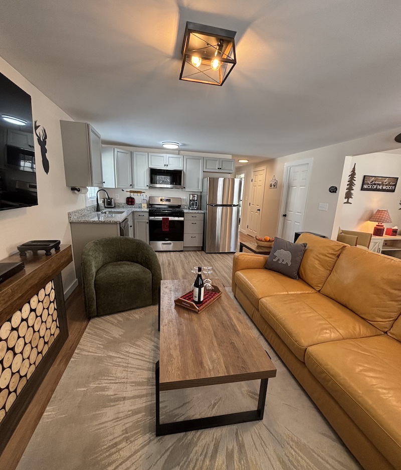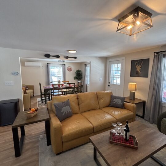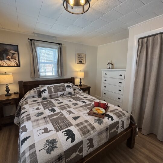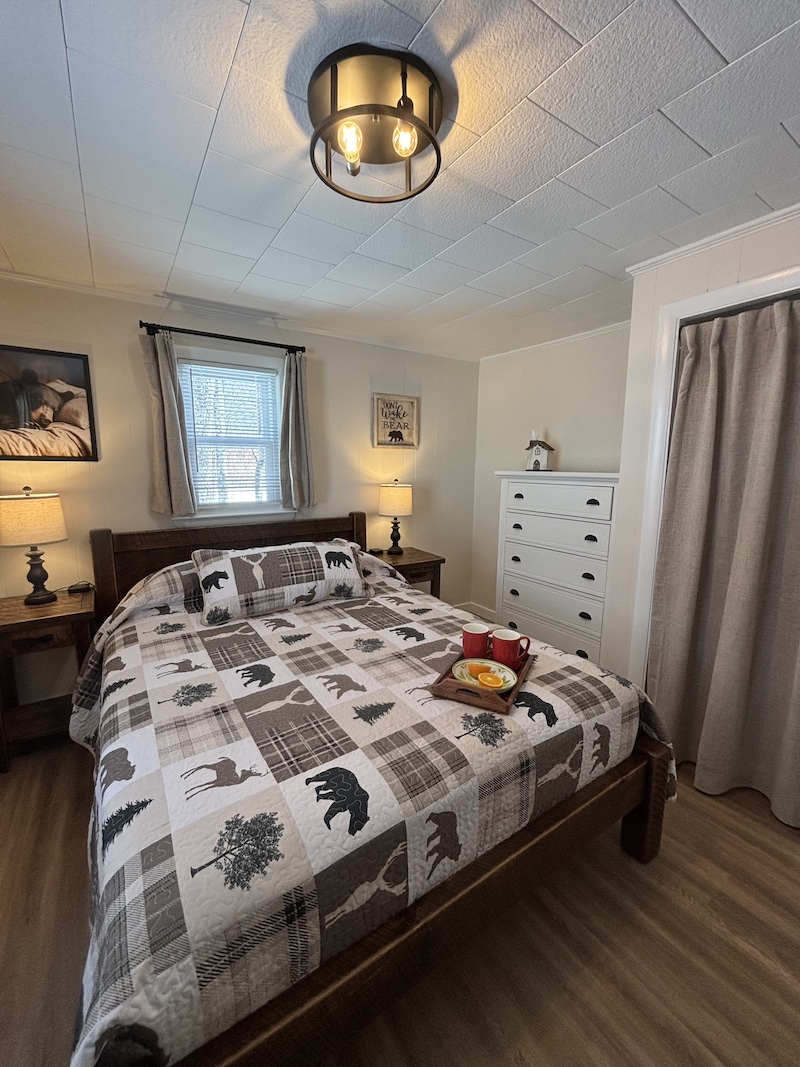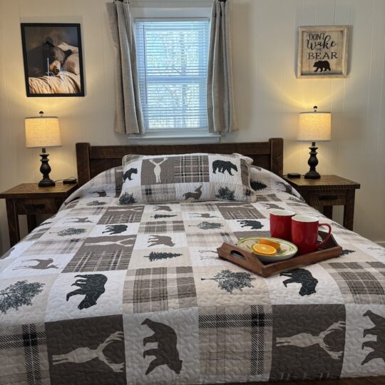 This cabin comes with two separate bedrooms (queen bed in each bedroom), living room with sleeper sofa, two bathrooms with shower and fully equipped kitchen. Enjoy evening by the campfire and fall asleep to the sounds of the river.
